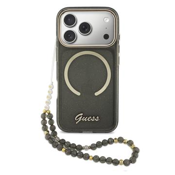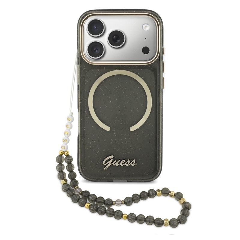 Coque MagSafe avec dragonne Guess IML Glitter Script pour iPhone 17 Pro - Coque arrière pailletée avec dragonne, protection PC+TPU, compatible MagSafe