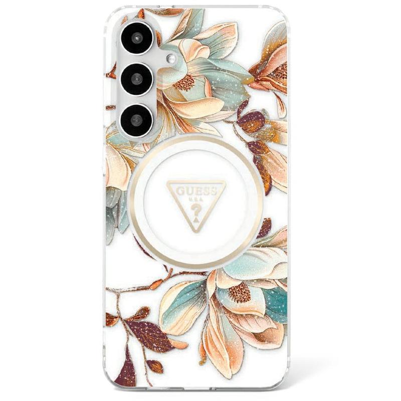 Coque MagSafe Guess Glitter Flowers Triangle Buttons pour Samsung Galaxy S25