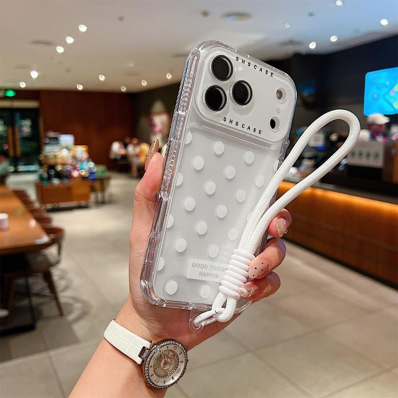 - Spécifications - Matériau : TPU + PC | Compatibilité : iPhone 17 Pro | Style : Transparent à pois | Accessoires : Etui + Film pour objectif + Courroie.