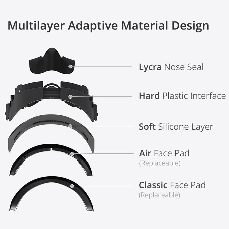 Fabriqué avec un tissu lycra respirant et un joint nasal bloquant la lumière, le masque réduit les fuites de lumière indésirables, ce qui vous permet de plonger plus profondément dans vos mondes VR. La conception légère vous permet de vous concentrer sur l'expérience, et non sur l'équipement.
