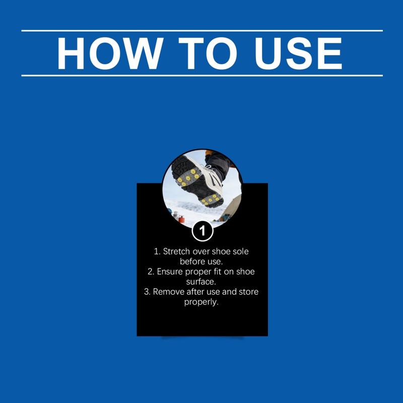 Les crampons de traction concentrent la pression sur de petits points, ce qui leur permet de mordre dans la glace et la neige tassée là où les semelles plates en caoutchouc glissent souvent. Pour une performance optimale, les crampons doivent être bien ajustés et utilisés sur la glace et la neige. Marcher sur de longues distances sur des sols intérieurs nus peut user les crampons plus rapidement.