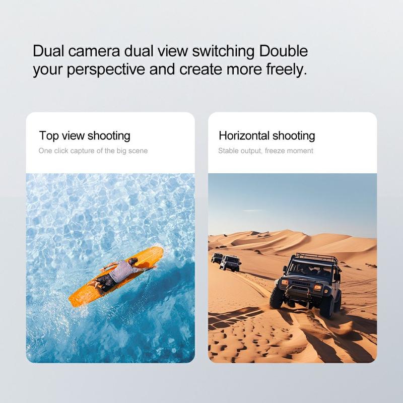 - L'angle de l'objectif réglable à 90° permet de capturer plus facilement différentes perspectives pendant le vol et le vol stationnaire.