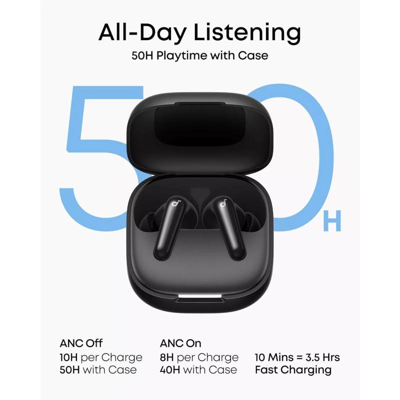 Avec jusqu'à 10 heures d'autonomie en lecture sur une seule charge et jusqu'à 50 heures au total avec le boîtier de recharge, les Soundcore R60i NC sont conçus pour une utilisation quotidienne prolongée. La prise en charge de la recharge rapide ajoute un confort supplémentaire, vous offrant jusqu'à 3 heures d'écoute après seulement 10 minutes de recharge. La résistance à l'eau et à la poussière IP55 des écouteurs en fait également un choix fiable pour le sport, l'utilisation en extérieur et le port quotidien.