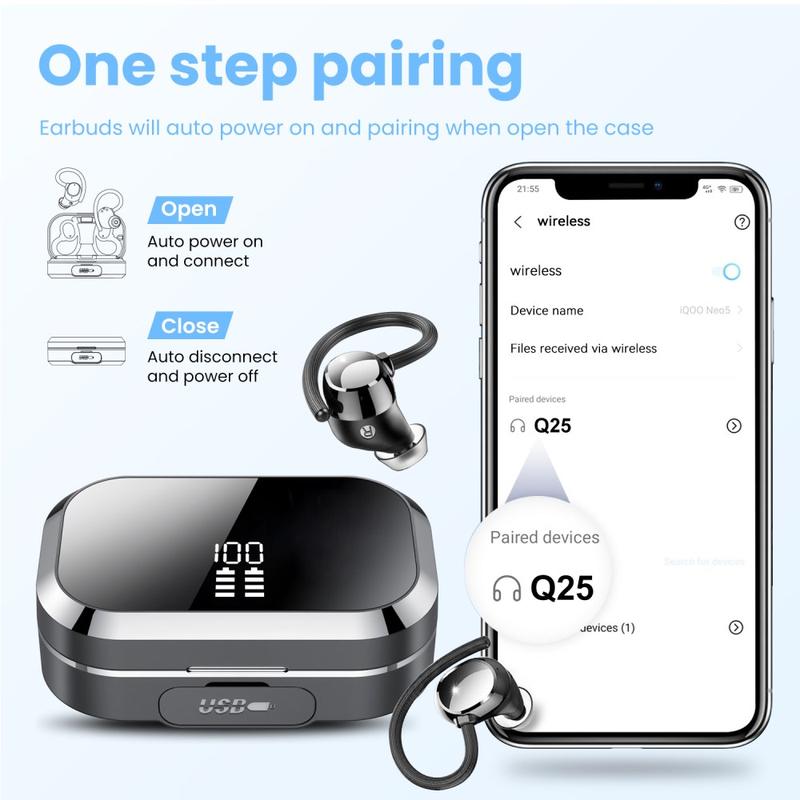 Les écouteurs sans fil Q25 sont conçus pour les utilisateurs qui recherchent à la fois un maintien plus sûr, une autonomie pratique et une écoute quotidienne flexible, le tout dans un format compact. Grâce à leur design ergonomique avec contour d'oreille, ils restent confortablement en place pendant les séances de sport, les trajets quotidiens, les promenades et l'utilisation au quotidien, tandis que le boîtier de recharge inclus offre un confort supplémentaire grâce à sa fonction de batterie externe intégrée. Cela fait des Q25 un choix judicieux pour ceux qui recherchent plus qu'une simple paire d'écouteurs sans fil standard.