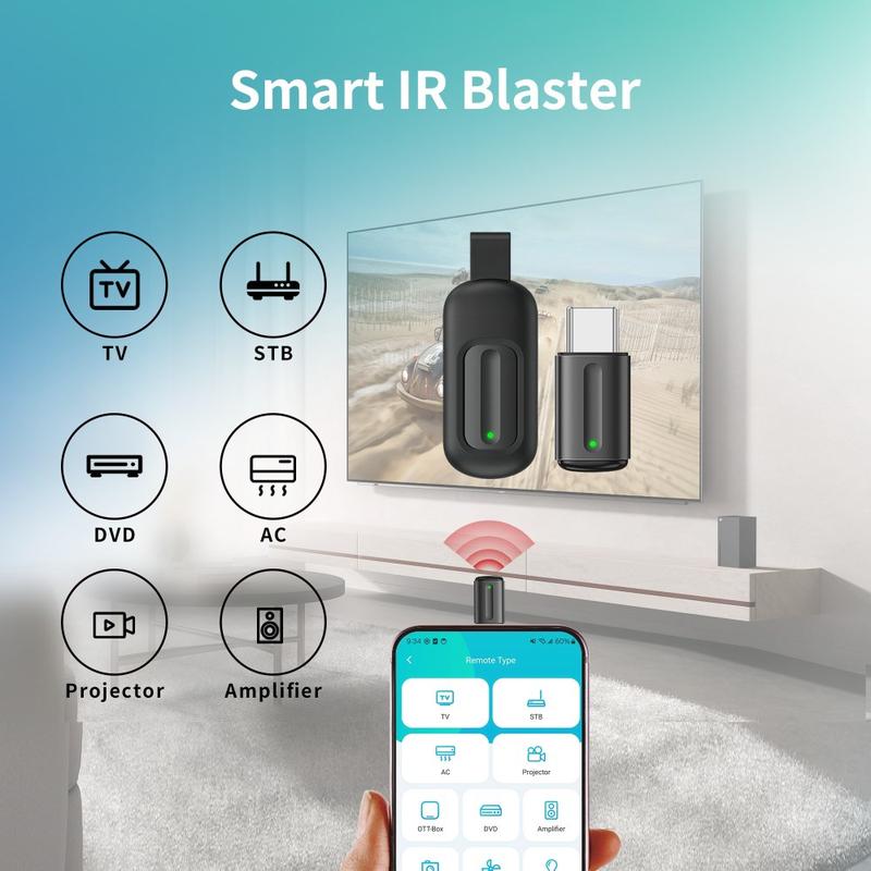 Pas de piles, pas de charge et pas de restrictions spécifiques aux applications - branchez simplement l'adaptateur dans le port Lightning/Type-C de votre appareil et profitez d'un contrôle immédiat sur les appareils électroniques domestiques basés sur les infrarouges.