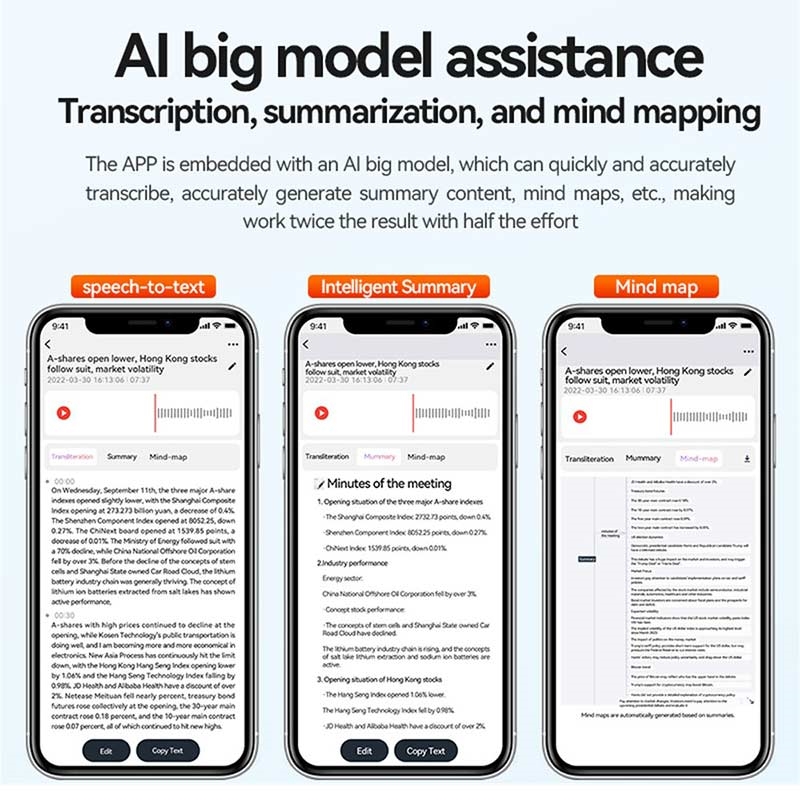Transcription optimisée par l'IA : Connectez-vous à l'application AIREC via Bluetooth pour profiter de la transcription et de la traduction en temps réel dans 188 langues grâce à l'intégration de ChatGPT.