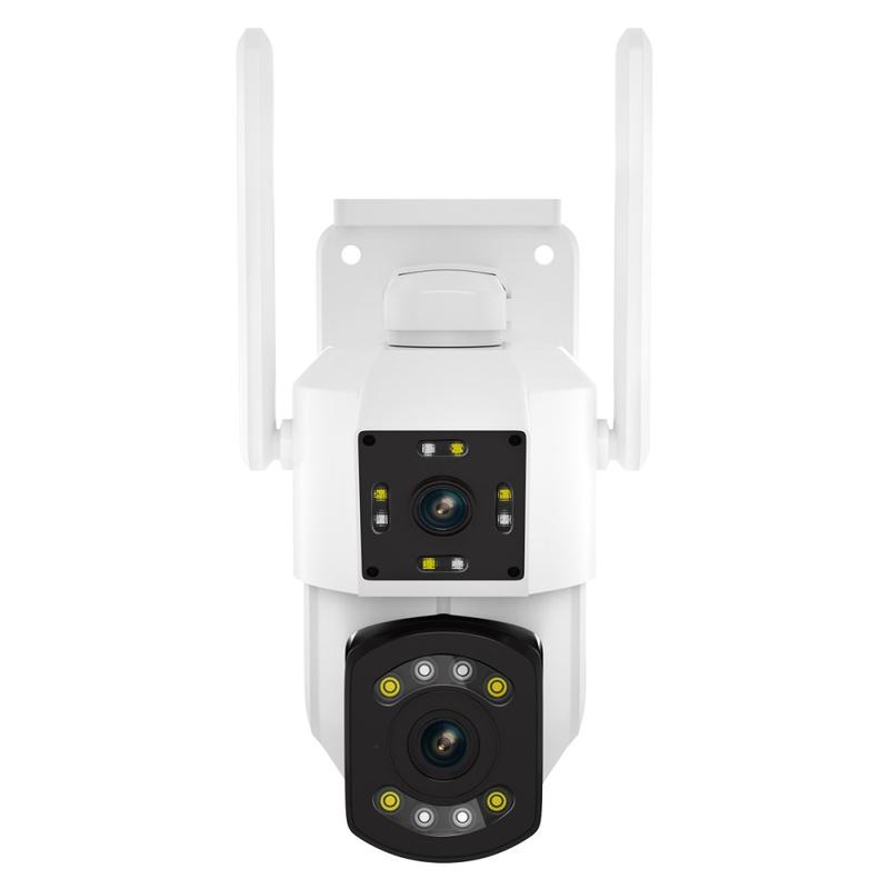 Protégez les entrées, les terrasses ou les devantures de magasins avec une caméra qui voit plus. L'ESCAM PT210 combine deux objectifs de 3MP et un mouvement panoramique de 355° / 140° d'inclinaison pour offrir une couverture transparente du double écran avec une résolution nette de 2304 × 1296. Huit LED infrarouges et huit projecteurs blancs s'allument automatiquement, offrant une vision nocturne en noir et blanc ou des images en couleur jusqu'à 20 m sans projecteurs supplémentaires.