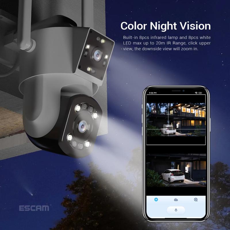 • ESCAM PT210 Caméra PTZ à double objectif avec audio bidirectionnel et vision nocturne couleur - 3MP, WiFi
