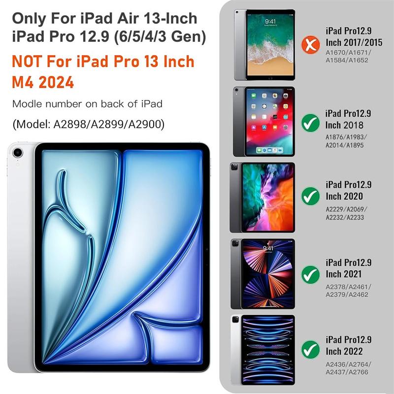 Améliorez votre iPad Air 13 2026/2025/2024, iPad Pro 12.9 2022/2021/2020/2018 avec l'étui clavier Bluetooth, un accessoire 2-en-1 multifonctionnel qui allie protection, productivité et style. Fabriqué en polyuréthane de première qualité, cet étui élégant offre une protection complète contre les rayures, les chocs et les empreintes digitales, tout en conservant un aspect professionnel. Le clavier Bluetooth se connecte sans fil pour une frappe fluide et réactive, tandis que le pavé tactile intégré prend en charge le contrôle multi-gestes pour une navigation sans effort. Le clavier rétroéclairé vous permet de taper confortablement même dans des environnements peu éclairés. Le support réglable intégré offre un angle de vue ergonomique, ce qui le rend parfait pour la saisie, la lecture en continu ou la lecture. Conçu pour les affaires, les voyages ou l'usage quotidien, cet étui-clavier transforme votre tablette en station de travail portable.