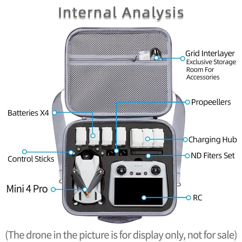 - Conception personnalisée : Conçue spécifiquement pour le DJI Mini 4 Pro, cette mallette comporte des compartiments précis pour accueillir en toute sécurité le drone, la télécommande avec écran, trois batteries, le concentrateur de charge, le chargeur et d'autres petits accessoires.