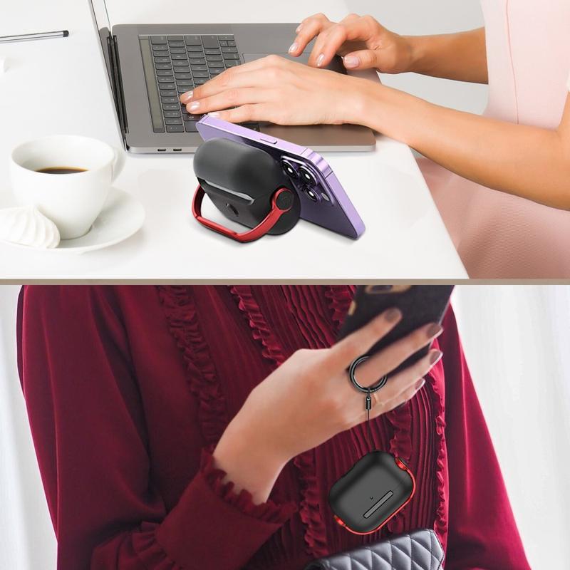L'anneau métallique intégré fonctionne à la fois comme un pied-de-biche pour un visionnage mains libres et comme un crochet de transport pour attacher vos AirPods à des sacs, des clés ou des ceintures.