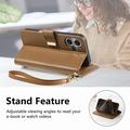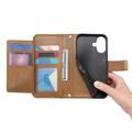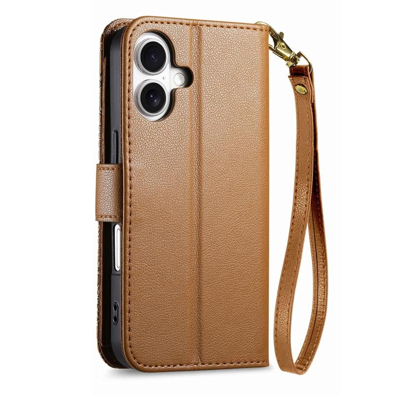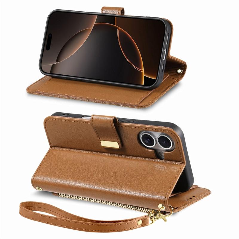 Etui iPhone 17 à motifs floraux et de feuilles avec pochette zippée et dragonne - Marron