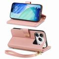 Etui iPhone 17 Pro à motifs floraux et de feuilles avec pochette zippée et dragonne - Rose