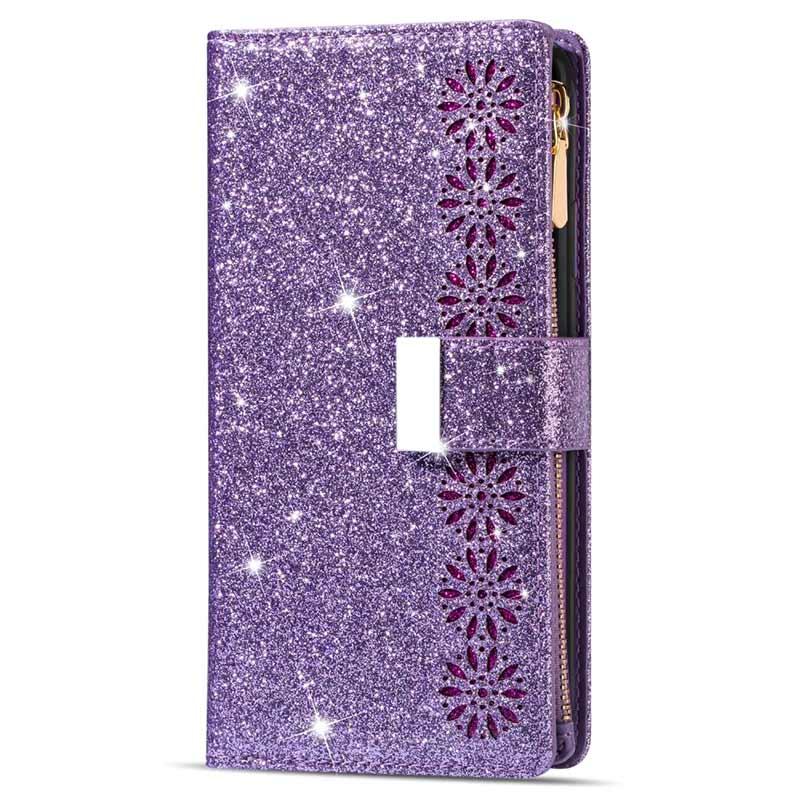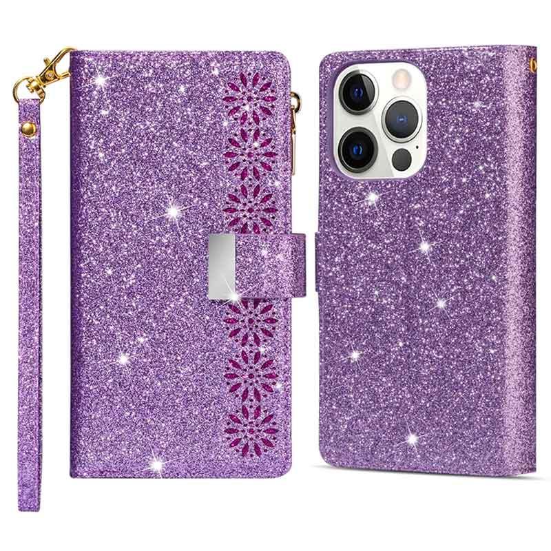 The most elegant way to carry your iPhone 14 Pro Max is shielded with this sparkling wallet case. It provides excellent all-around protection, while the strong magnetic closure keeps all your valuables and your iPhone 14 Pro Max secured. The case features multiple card slots and a large zipper pocket, while the foldable back doubles as a stand for convenient media watching. This stylish wallet case for iPhone 14 Pro Max comes with a handy lanyard for extra safety in crowded places.