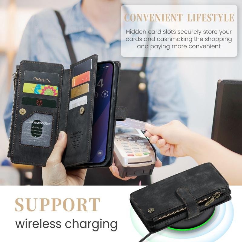 L'étui portefeuille multifonction Caseme C30 pour iPhone 16 Plus apporte une protection complète exceptionnelle et un design exclusif et raffiné. Cette coque élégante est fabriquée en polyuréthane de qualité supérieure, renforcée par une coque intérieure en TPU résistant aux chocs qui épouse parfaitement votre iPhone 16 Plus. Pendant ce temps, l'étui portefeuille Caseme C30 est doté de nombreux emplacements pour cartes, d'un grand compartiment pour billets à l'intérieur et d'une poche extérieure zippée, le tout protégé par une fermeture magnétique sécurisée.