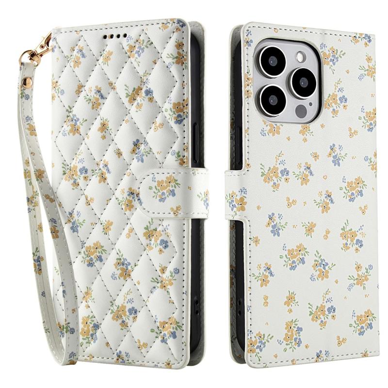 Étui portefeuille à motif floral rhombique pour iPhone 16 Pro - avec dragonne et fentes pour cartes