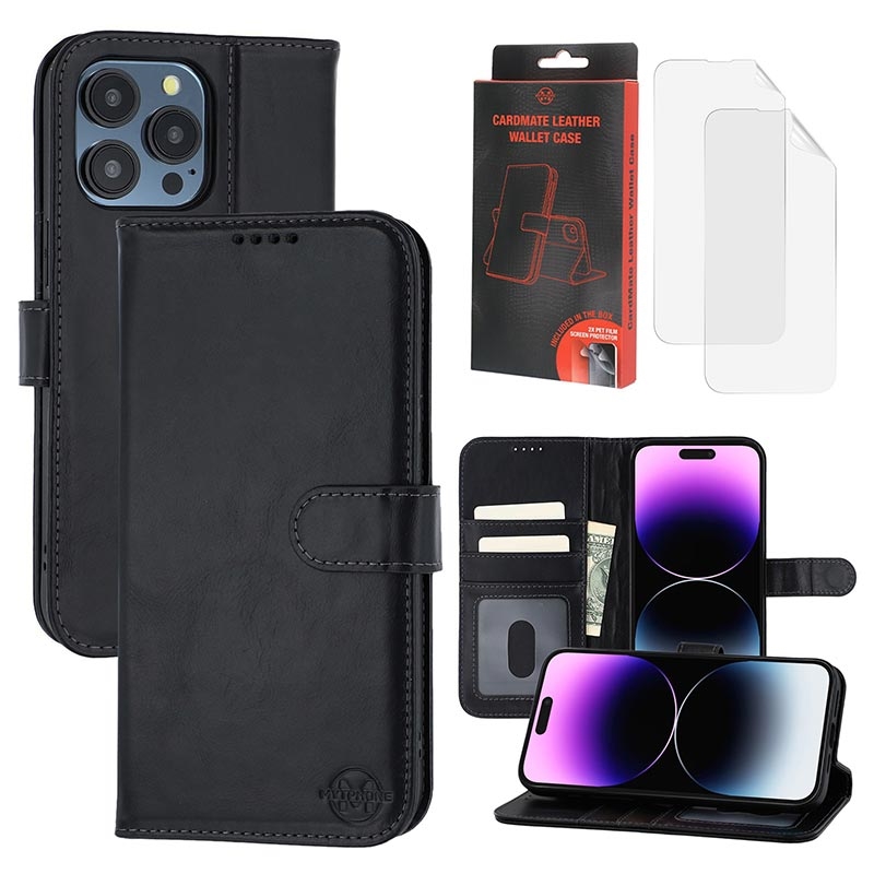 MyTPhone CardMate Premium étui portefeuille en cuir pour iPhone 14 Pro - Stand, porte-cartes, recharge sans fil, 2 protections d'écran
