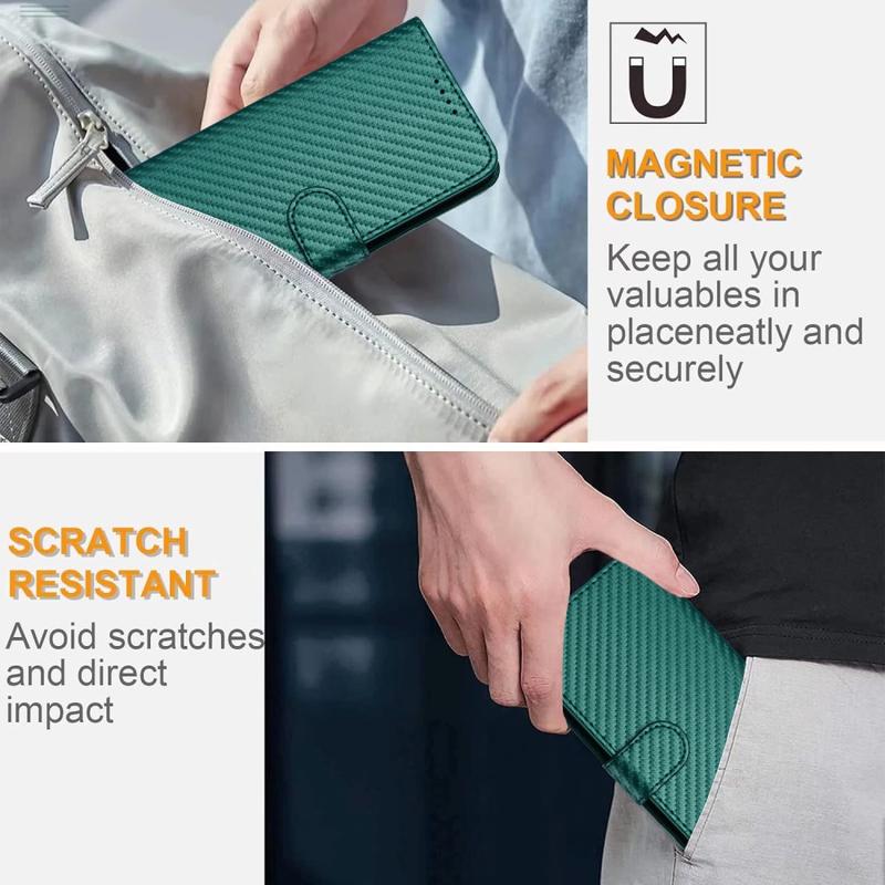 Cet étui portefeuille offre un design élégant, une protection fiable et une utilisation intelligente. La finition texturée en fibre de carbone ajoute un aspect moderne et professionnel, tandis que la couche intérieure en TPU absorbe les chocs en cas de chute accidentelle. Doté d'une fonctionnalité mains libres et d'une sangle amovible, il est conçu pour le confort et la polyvalence.