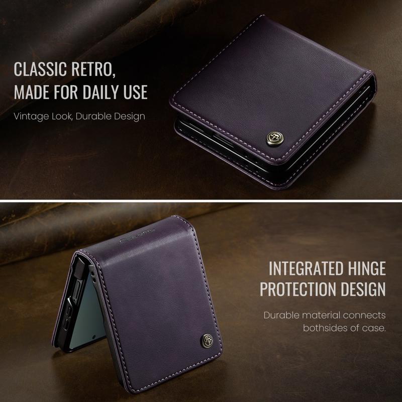 L'étui portefeuille CASEME 033 pour Samsung Galaxy Z Flip7 est fabriqué en polyuréthane à texture de veau associé à du TPU. Il offre une protection intégrale contre les rayures, les chocs et l'usure quotidienne, tout en conservant un design élégant et haut de gamme.