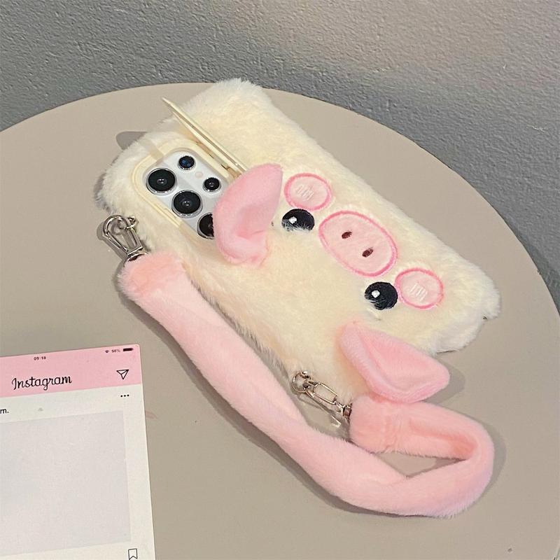 Etui en peluche pour porcelet avec béquille et dragonne pour Samsung Galaxy S24 Ultra
