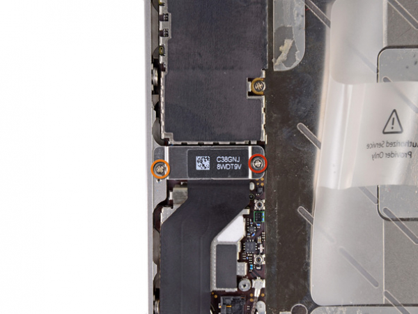 Avant de remettre les vis de l'assemblage haut-parleur, assurez-vous que les broches de mise à la terre Wi-Fi sont installées au-dessous du bord du boîtier métallique de l'iPhone comme on le voit sur la troisième image.