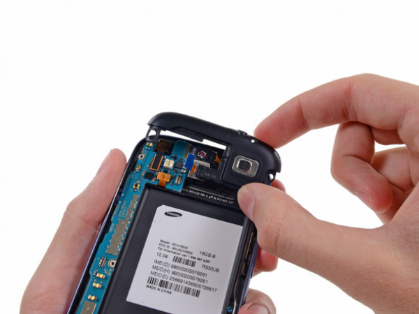 Insérer l'outil d'ouverture en plastique ou l'ongle dans l'encoche de l'espace entre la coque arrière et le reste du téléphone, située dans la partie supérieure du dispositif.