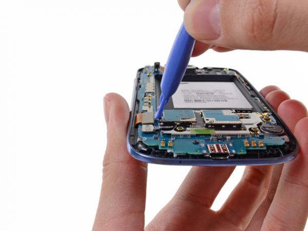 Insérer l'outil d'ouverture en plastique dans la petite encoche au-dessus de la batterie.