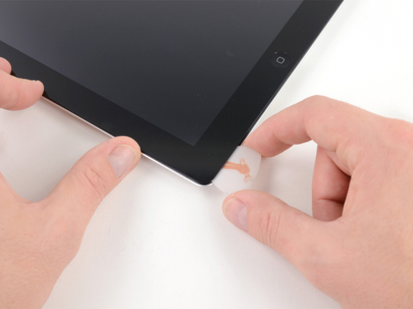 Faire glisser le coin du médiator le long du bord de l'iPad, relâchant l'adhésif ainsi.