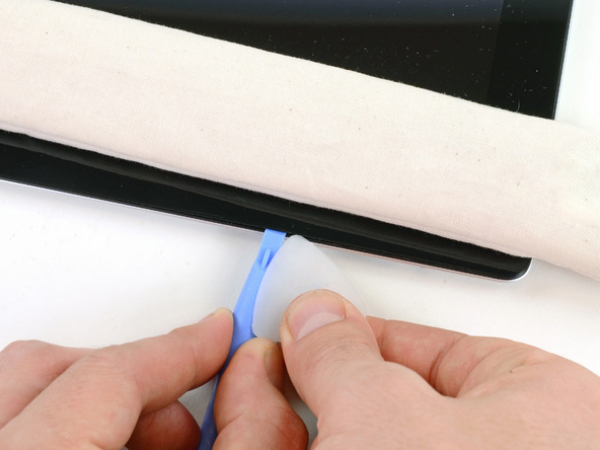 Une partie de l'adhésif le long du périmètre de l'iPad aurait pu se recoller. Si c'est le cas, faire glisser le médiator sous le bord de l'iPad où la vitre avant est toujours collée et "couper" l'adhésif.