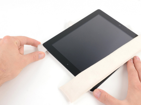 Poser l'iOpener à plat sur le bord droit de l'iPad, en le lissant de telle sorte qu'il y ait un bon contact entre la surface de l'iPad et de l'iOpener.