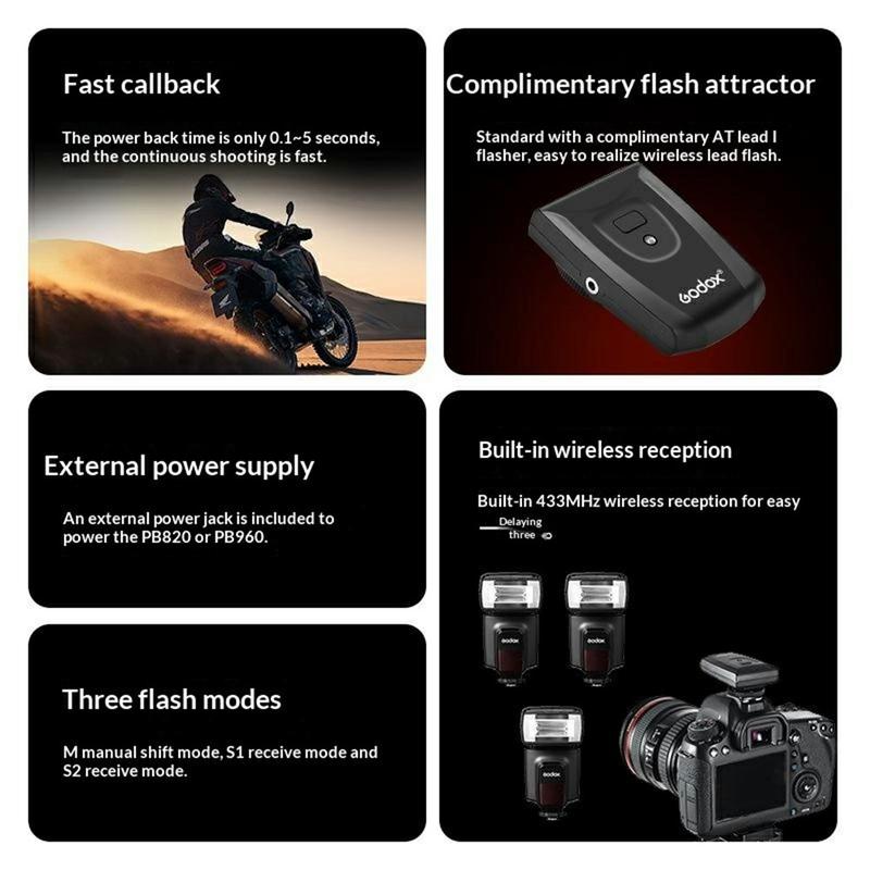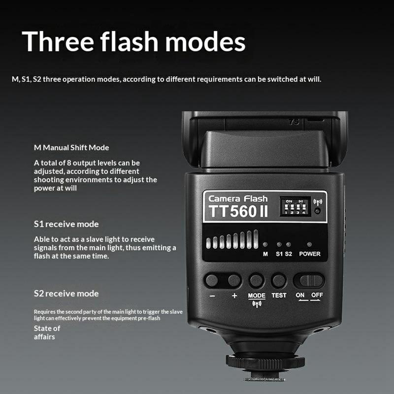 Le GODOX TT560 II intègre un récepteur sans fil 433MHz, permettant de déclencher un à trois flashes hors appareil photo grâce à 16 canaux disponibles et une portée de transmission allant jusqu'à 15 m. Cela le rend utile pour les configurations de portraits, la photographie de produits, l'éclairage créatif en intérieur et d'autres scénarios où un placement plus flexible du flash est nécessaire. Trois modes de flash sont pris en charge : Manuel (M), esclave optique (S1) et pré-flash ignoré (S2), vous offrant ainsi davantage d'options pour différents environnements d'éclairage et styles de prise de vue.