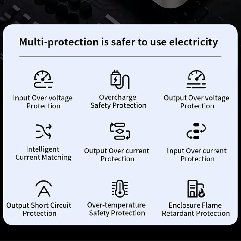 - Chargement intelligent - La technologie Smart IC assure un chargement sûr et efficace avec une protection contre les surintensités, les surtensions et les courts-circuits.