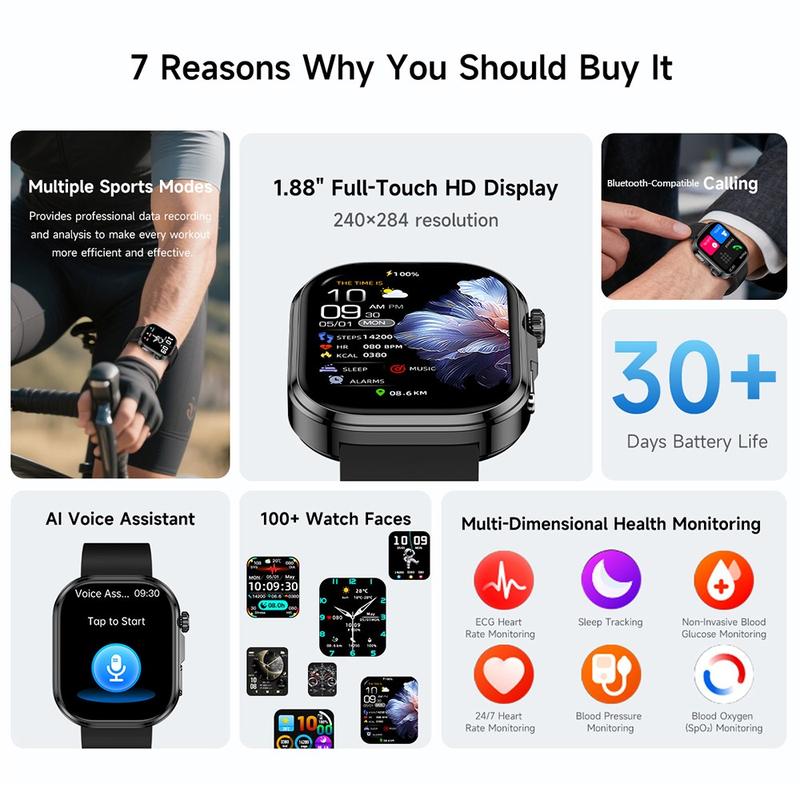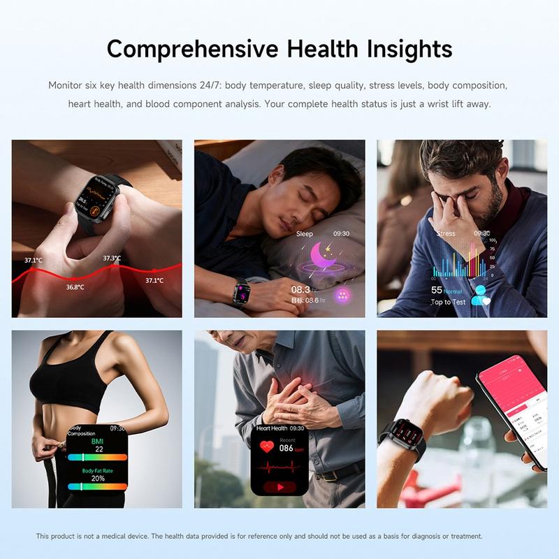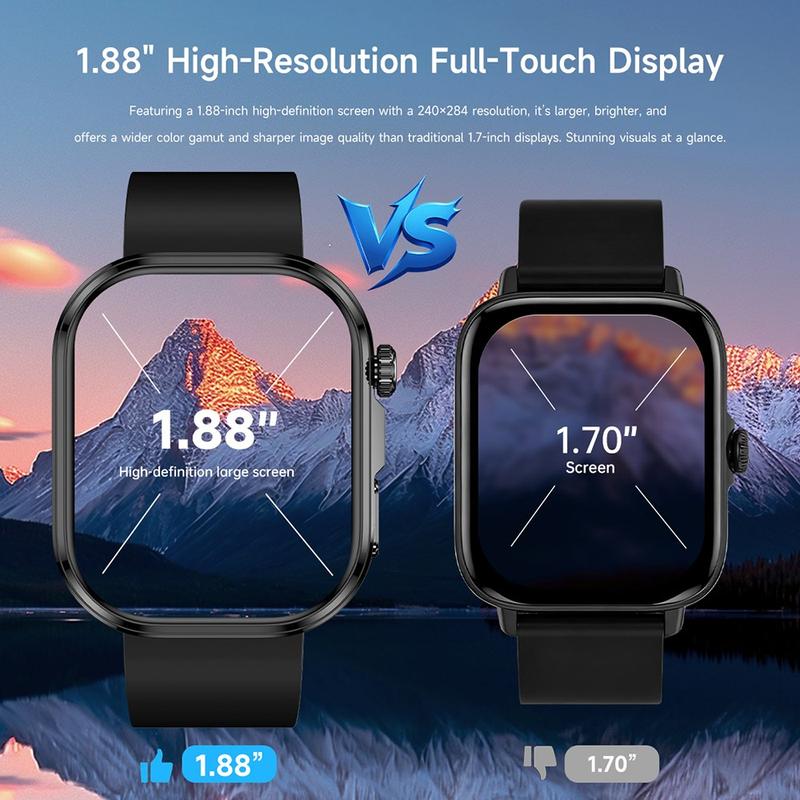 La montre intelligente GE52 combine une surveillance avancée de la santé avec une commodité moderne, offrant une mesure ECG, un suivi de la fréquence cardiaque, une détection de l'oxygène dans le sang, une surveillance de la température et plus encore, le tout à partir de votre poignet. Son grand écran HD de 1,88 pouce offre des images nettes et éclatantes qui surpassent les écrans traditionnels de 1,7 pouce, rendant l'utilisation quotidienne plus claire et plus agréable.
