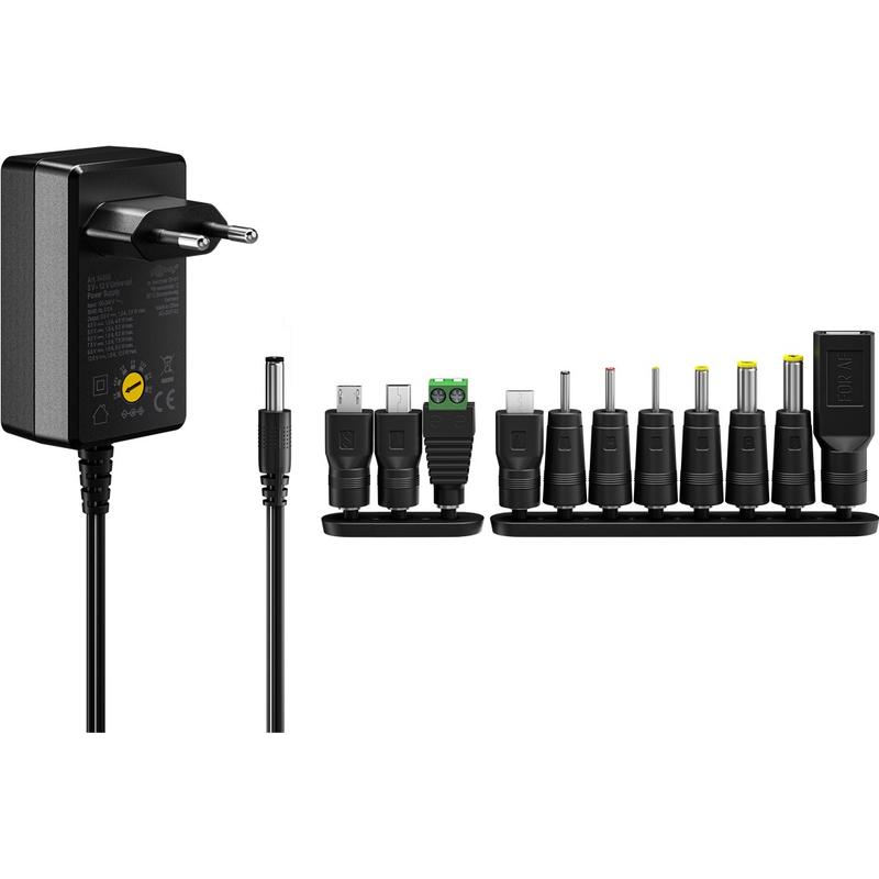 Conçue pour une compatibilité et une commodité optimales, l'alimentation universelle Goobay gère sans effort des tensions allant de 3 V à 12 V tout en délivrant un maximum de 12 W / 1,0 A. Avec 11 adaptateurs inclus - allant des pointes CC classiques à l'USB-C de pointe - elle fournit une solution unique et fiable pour alimenter divers petits appareils tels que des routeurs, des bandes LED, des radios portables ou des chargeurs de batterie.