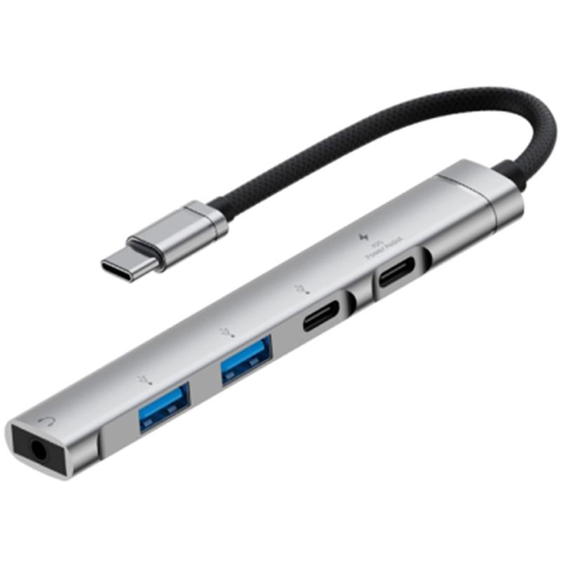 • Hub USB-C multifonctionnel 5-en-1 en alliage d'aluminium - 1x port de charge Type-C, 1x port de données Type-C, 2x USB 2.0, prise casque 3.5mm