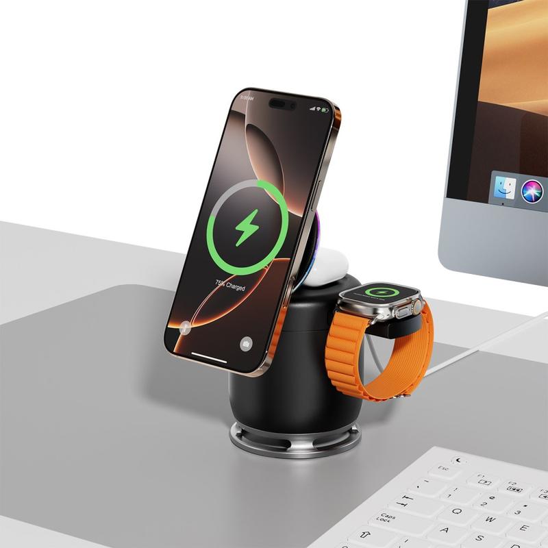 - Chargement 3 en 1 : téléphone 15W + montre 2,5 W + écouteurs 5 W simultanément