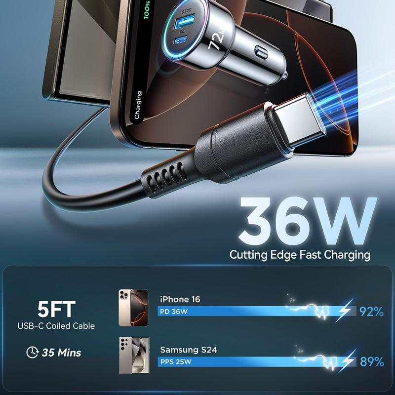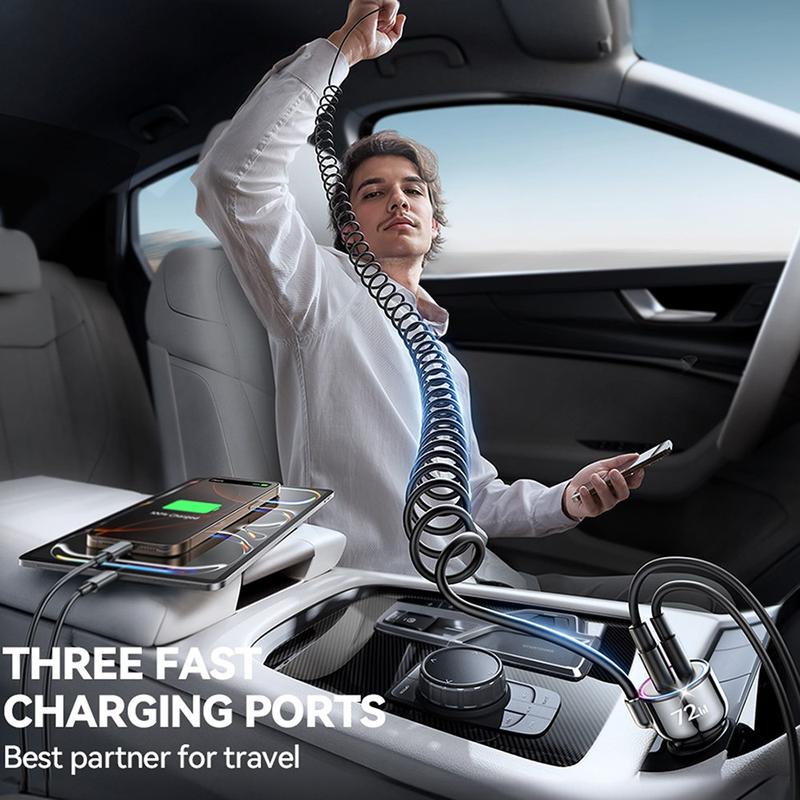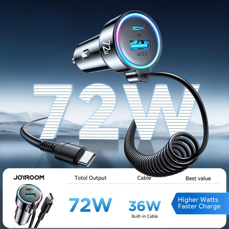 • Joyroom CL07 72W Chargeur de voiture rapide 3-en-1 avec câble Type-C de 1,6m et ports USB-C/USB-A