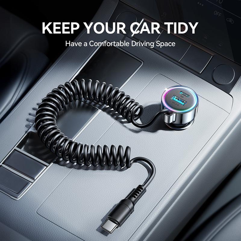 Gardez chaque passager alimenté pendant les longs trajets quotidiens ou les voyages de vacances. Le Joyroom CL07 délivre une puissance combinée de 72W, associant un port USB-C PD/PPS, un port USB-A QC 3.0 et un câble spiralé USB-C extensible de 1,6 m intégré. Un anneau coloré à 7 LED permet de repérer facilement les ports la nuit, tandis que la protection de sécurité sextuple et le boîtier PC ignifugé (grade V-0) garantissent la tranquillité d'esprit pour vous et votre véhicule.