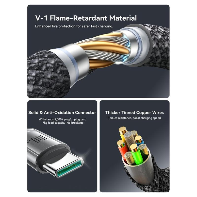 Si vous utilisez plusieurs appareils USB-C, ce câble réduit l'encombrement et simplifie la charge. Vous bénéficiez d'une prise en charge haute puissance de 100 W, d'une gestion intelligente de l'alimentation et d'une construction tressée résistante conçue pour une véritable utilisation quotidienne, sans oublier le lien organisateur pratique pour un rangement aisé.