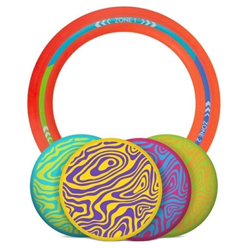 - Le kit complet comprend 1 anneau cible volant, 4 disques Wingman en silicone, une feuille de score et un sac de rangement avec poignée de transport.