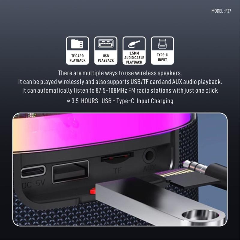 Le KONFULON F27 combine un son stéréo puissant avec la liberté du sans fil et un micro intégré, vous donnant la flexibilité d'écouter de la musique, de chanter ou de parler n'importe où. C'est une centrale compacte conçue pour rendre chaque moment plus musical.