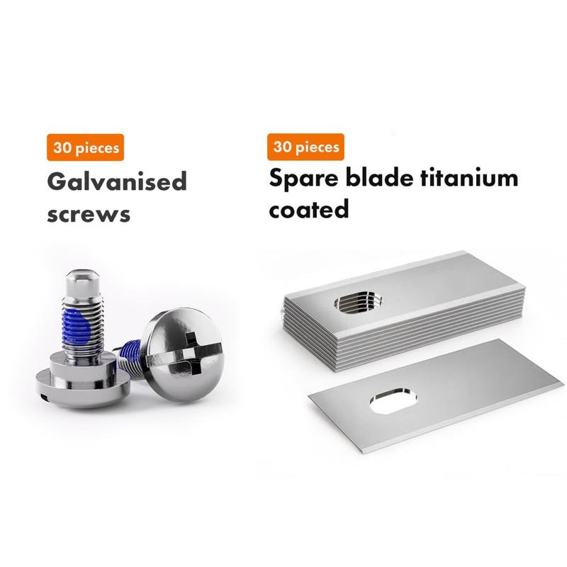 C'est également une option pratique, car le kit comprend à la fois les lames et les vis, vous offrant ainsi tout le nécessaire pour l'entretien courant dans un seul emballage. Le revêtement en titane et la conception anticorrosion des vis apportent une valeur ajoutée pour une utilisation en extérieur tout au long de la saison de tonte.