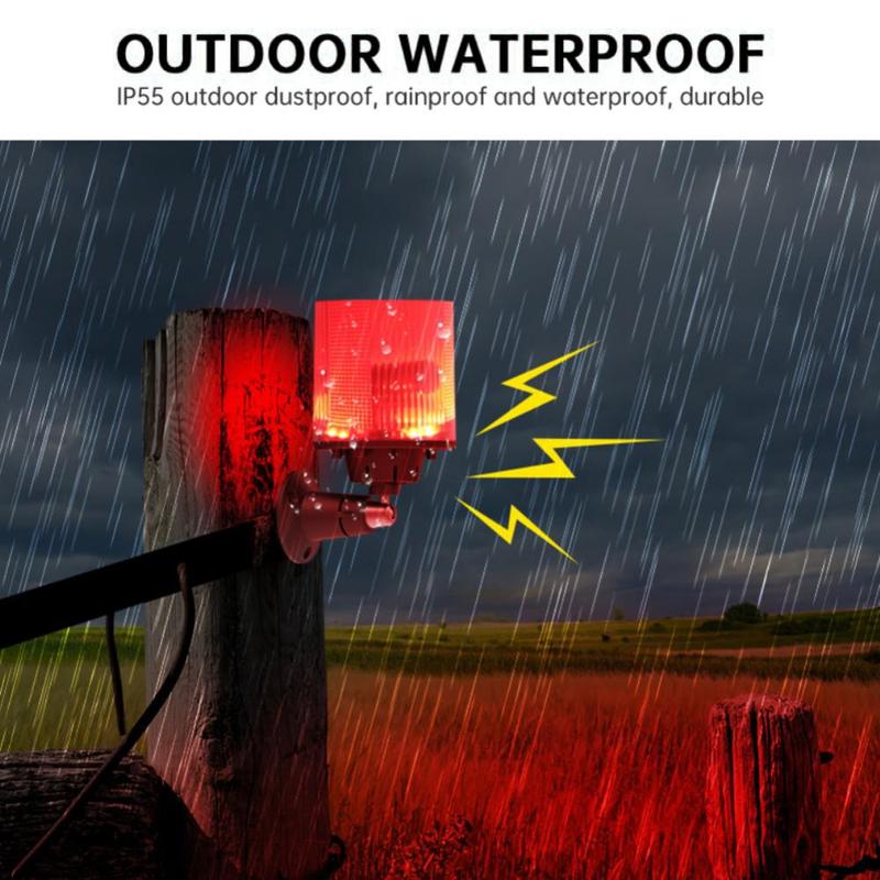 Assurez la sécurité des jardins, des vergers et des chantiers de construction 24 heures sur 24. Le N911L combine une sirène de 129dB, huit LED rouges clignotantes et une bibliothèque de sons d'avertissement sélectionnables (aboiements de chiens, hurlements de loups, pétards, etc.) pour effrayer les voleurs et les animaux sauvages. Un panneau solaire monocristallin recharge la batterie de 1 200 mAh pendant la journée, tandis que l'électronique intelligente déclenche une salve de sons et de lumières de 20 secondes toutes les trois minutes après la tombée de la nuit. Besoin de quelque chose de personnalisé ? Enregistrez votre propre message de 20 secondes en appuyant sur un bouton. Pas de câblage, des coûts d'exploitation minimes - juste une protection fiable et résistante aux intempéries, partout où vous en avez besoin.