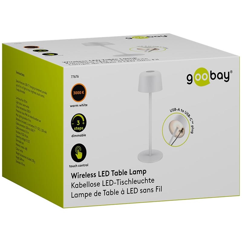Lampe de table LED sans fil Goobay - Taille S (25 cm), commande tactile, blanc chaud 3000 K, 150 lm, rechargeable par USB-C, IP44