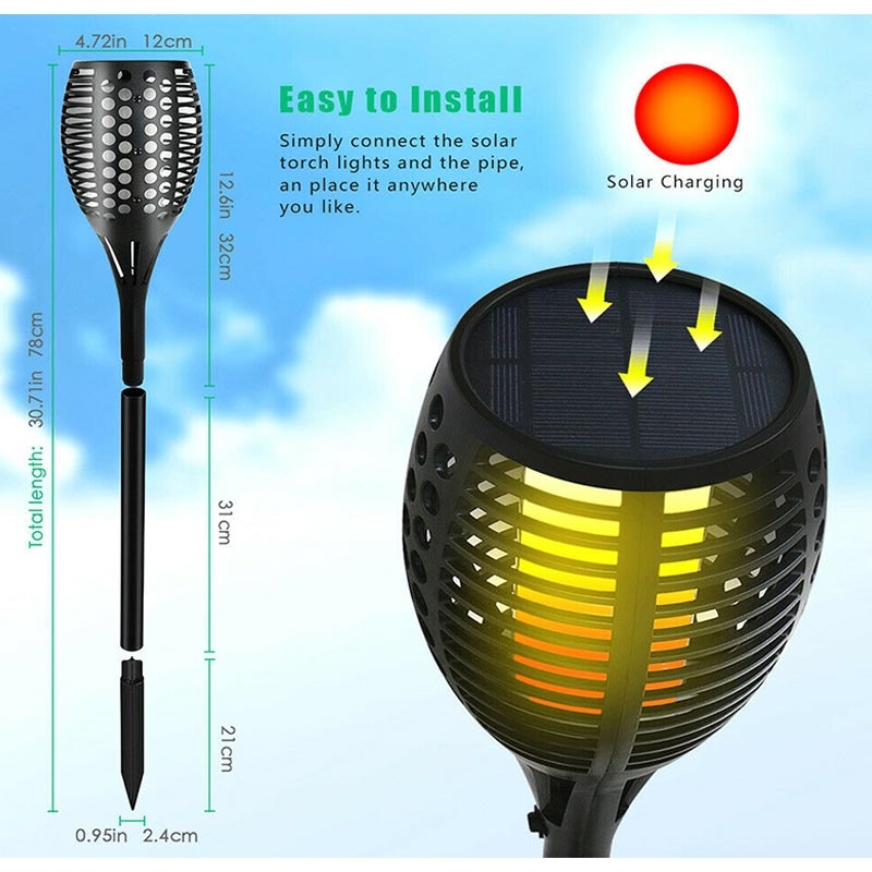 Avec un panneau solaire efficace en silicium monocristallin et une batterie Li-ion de 600mAh, les lampes à flamme fonctionnent jusqu'à 10 heures en été ou 7 heures en hiver après une charge complète de 8 heures.
