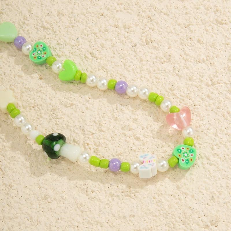 Apportez une touche mignonne et ludique à votre téléphone grâce à cette lanière de 20cm ornée de perles en forme de champignons. Conçue à la fois comme un accessoire décoratif et une lanière de poignet pratique, elle présente un mélange amusant de breloques en forme de champignons, de perles d'imitation, de cœurs, de fleurs et d'étoiles pour un look élégant au quotidien.