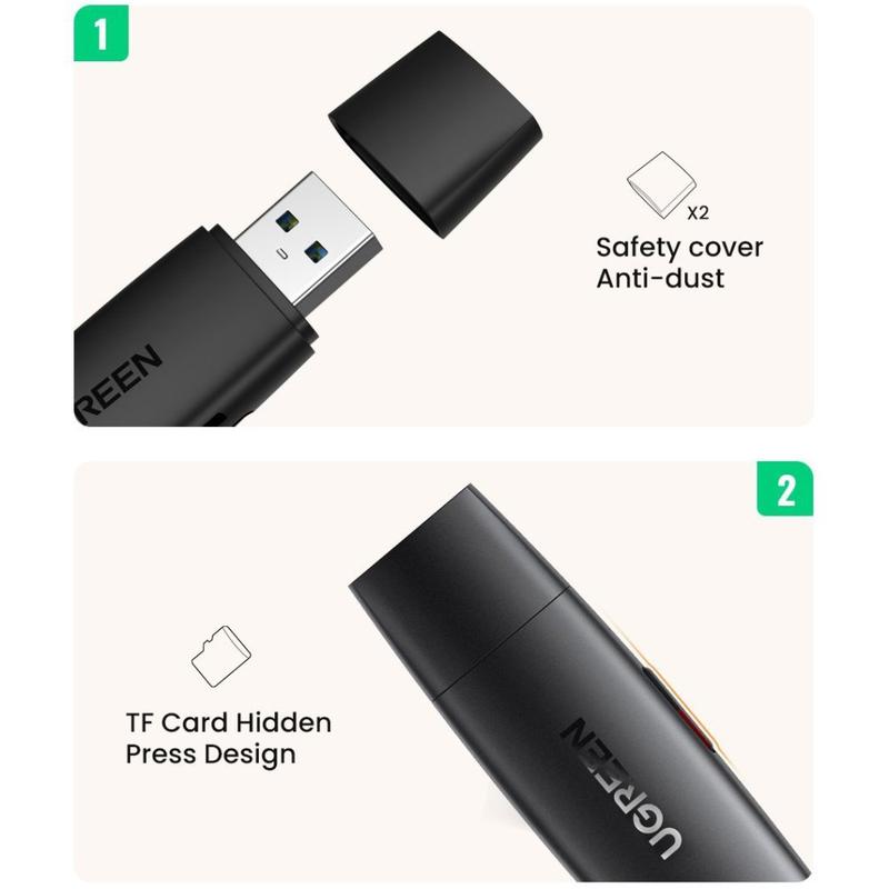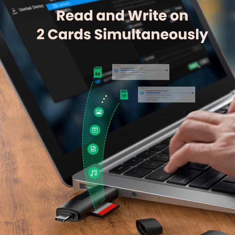 Transférez vos photos et vidéos plus rapidement où que vous soyez grâce au lecteur de cartes SD et microSD 2 en 1 UGREEN. Doté de connecteurs USB-A et USB-C, il fonctionne avec une large gamme d'ordinateurs portables, de PC, de téléphones et de tablettes compatibles OTG, ce qui le rend idéal pour les voyages, la création de contenu et les sauvegardes rapides. Les deux emplacements pour cartes vous permettent de lire et d'écrire simultanément sur des cartes SD et microSD, ce qui vous permet de copier des fichiers, de prévisualiser du contenu ou de déplacer des données entre les cartes sans avoir à changer d'adaptateur.