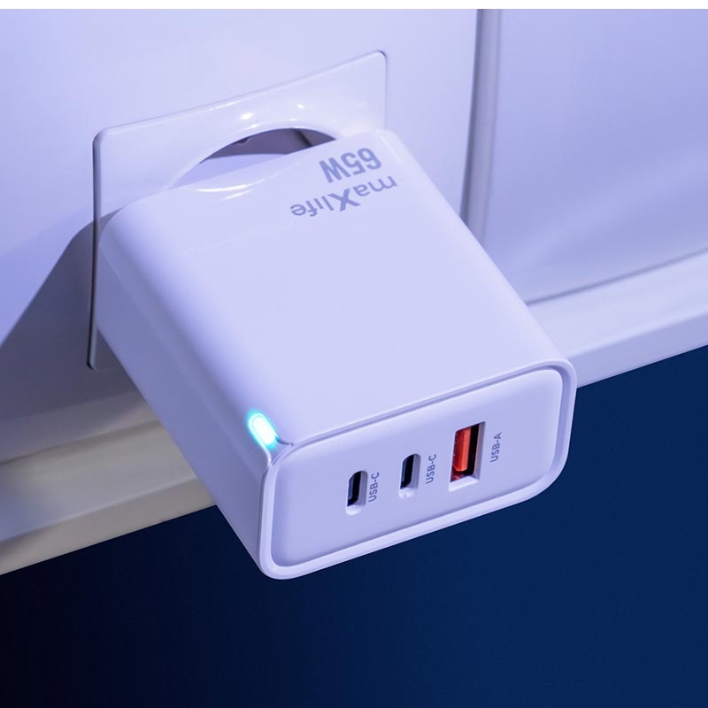 • Maxlife MXTC-09-65ACC Chargeur GaN - Adaptateur de charge rapide 65W avec 2× USB-C PD et 1× USB-A QC Ports