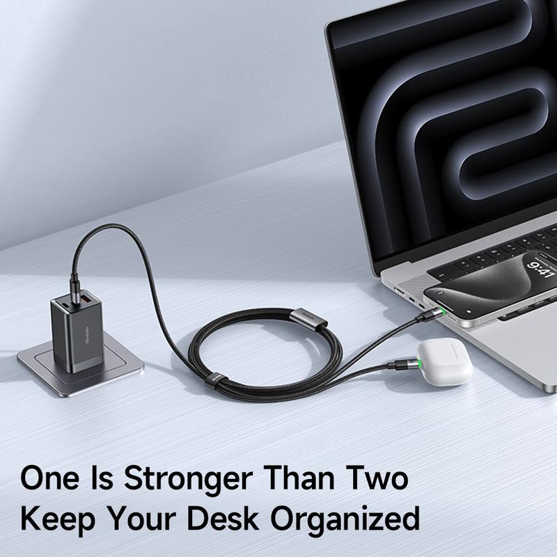 Un seul câble qui fait le travail de deux signifie moins d'encombrement, moins d'accessoires oubliés et moins de déchets électroniques. Sa puissance de 100W protège votre installation contre les ordinateurs portables de nouvelle génération, tandis que la séparation intelligente protège les gadgets d'aujourd'hui. Ajoutez à cela la tresse robuste et vous obtiendrez des années de service fiable, sans avoir à recourir à des remplacements bon marché.