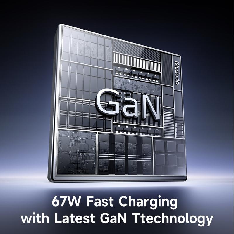 - L'architecture GaN délivre jusqu'à 67W tout en étant plus froide et plus petite que les briques de silicium traditionnelles.